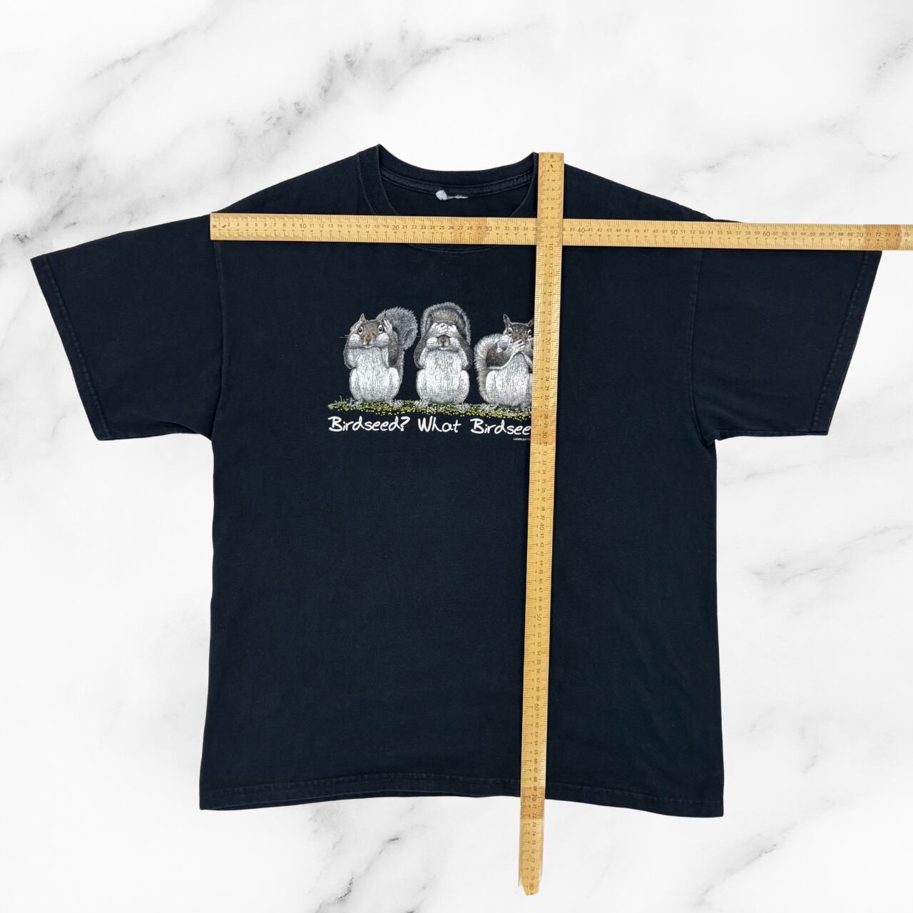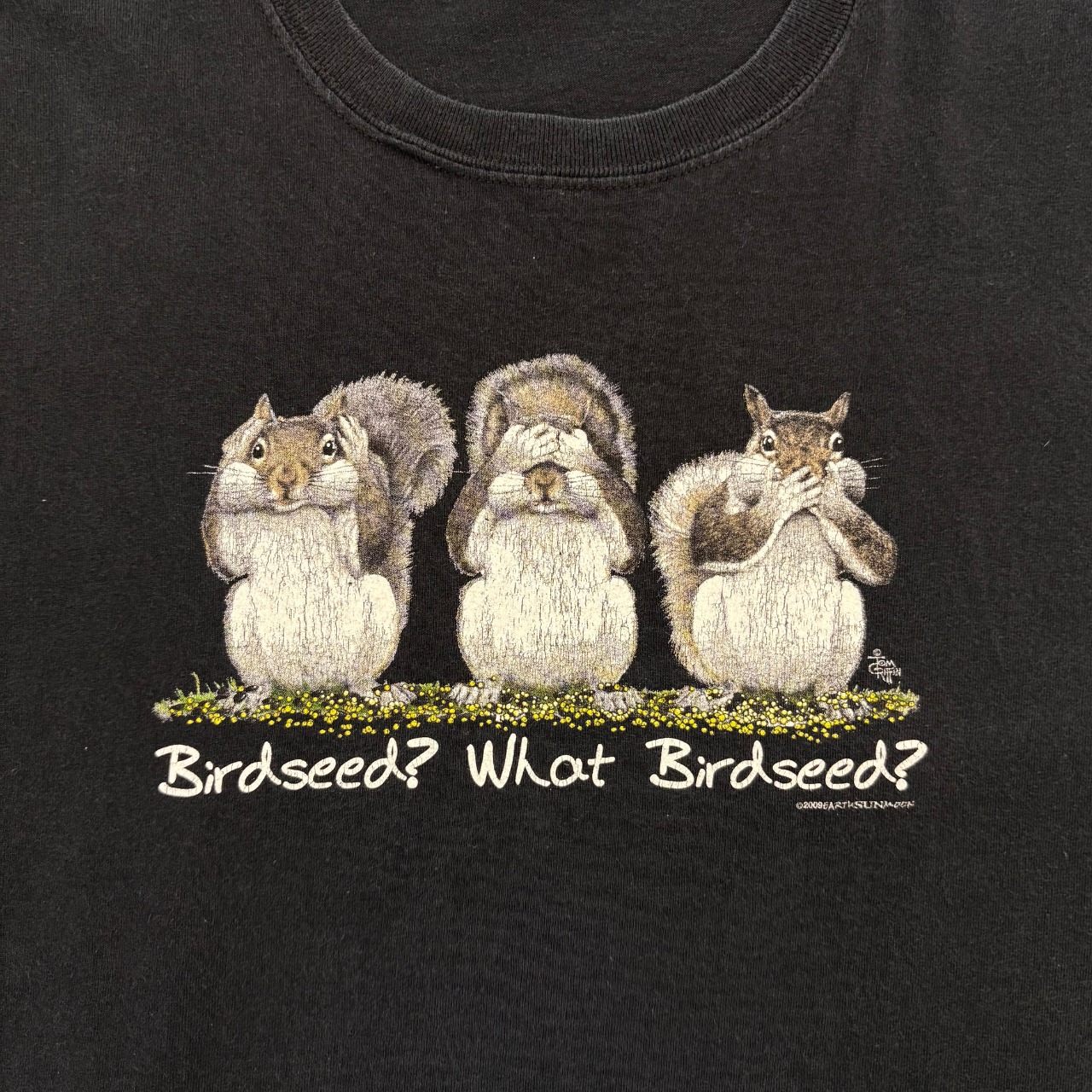Tシャツ ブラック パロディー”見ざる言わざる聞かざるがリスバージョン 鳥の餌知らない?え?鳥の餌って何?知らないよ” 無料配送