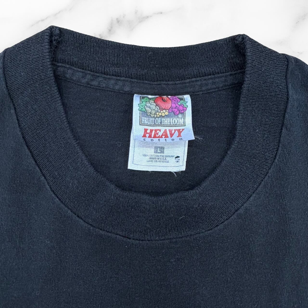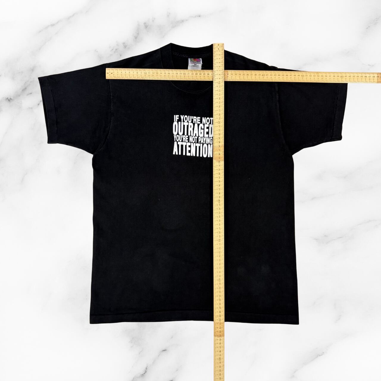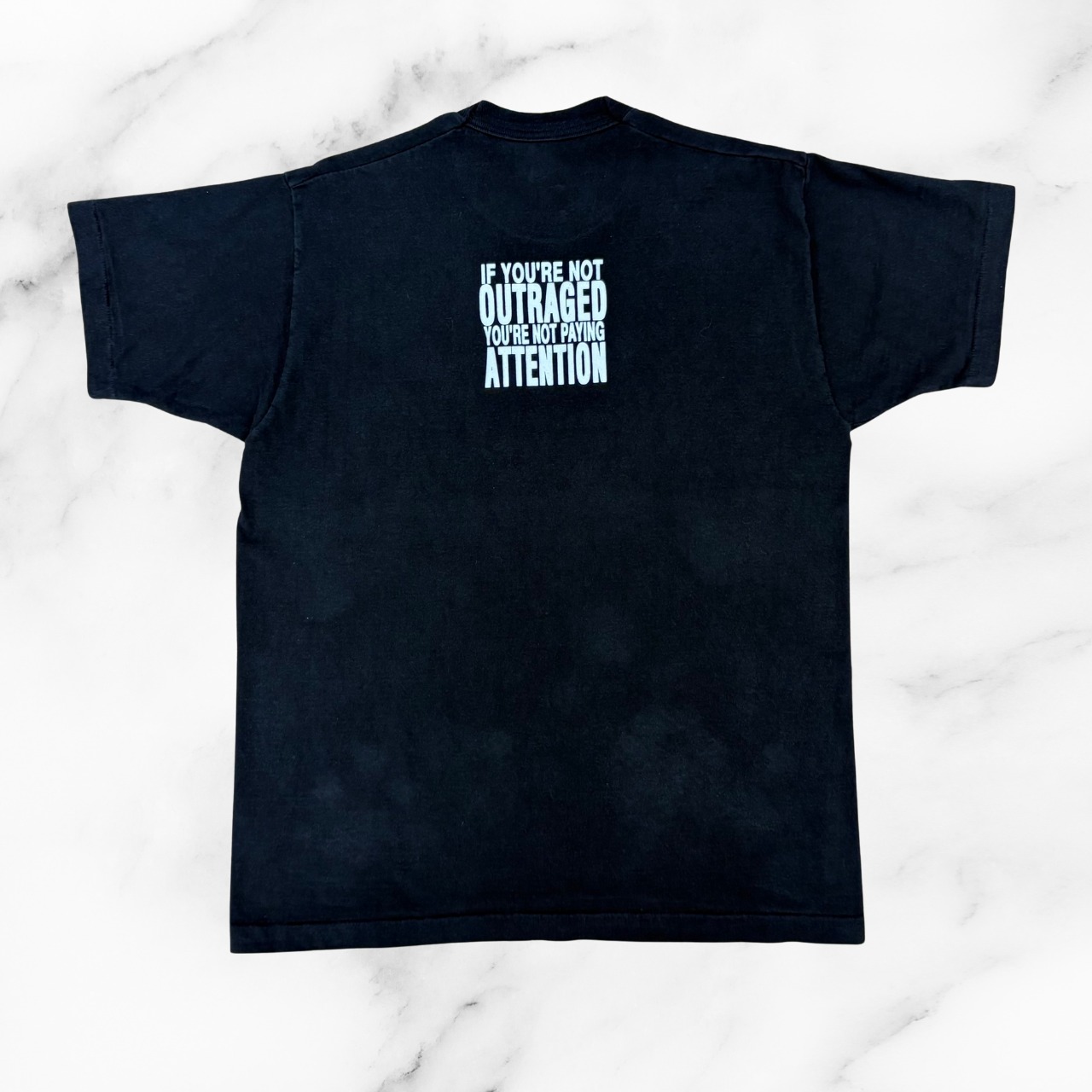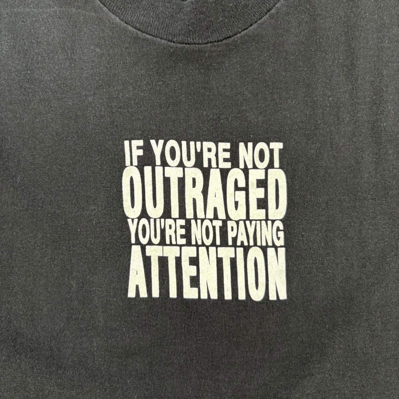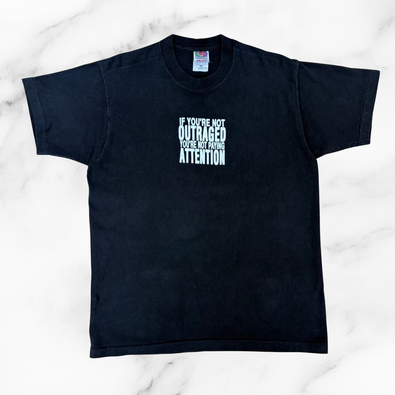 Tシャツ 90'sUSA製 黒地に”IF YOU'RE NOT OUTRAGE~” 袖、裾シングルステッチ 送料無料